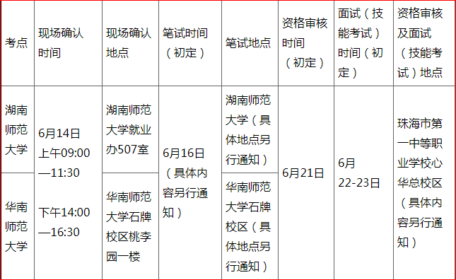 本次招聘分别在湖南师范大学(地址:湖南省长沙市岳麓区麓山路36号)和华南师范大学石牌校区(地址:广东省广州市天河区中山大道西55号)设置考点,考生只能根据要求在一个考点参加考试。